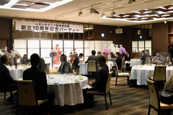 会場にはお祝いでいただいた花が並べられ華やかな空間となり、沖縄民謡の生演奏では皆様笑顔で盛り上がり、各テーブル、アクリル板越しではありますが各社の代表者様同士のお話にも花が咲いていたようで終始賑やかな宴となりました。